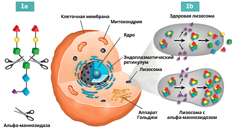 Альфа-маннозидоз — это редкая лизосомальная болезнь накопления (ЛБН), которая возникает вследствие мутаций в гене, кодирующем лизосомальный фермент альфа-маннозидазу. Данный фермент представляет собой экзоглюкозидазу, которая отщепляет α-связанные остатки маннозы от N-связей олигосахаридов. Если имеется дефект фермента альфа-маннозидазы, нарушается деградация гликопротеинов, что приводит к прогрессирующему накоплению богатых маннозой олигосахаридов в тканях, нарушению клеточных функций и апоптозу 1.