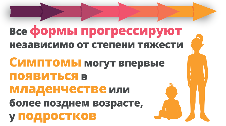 У грудных детей симптомы заболевания практически отсутствуют, однако начинают проявляться по мере прогрессирования заболевания 9A.